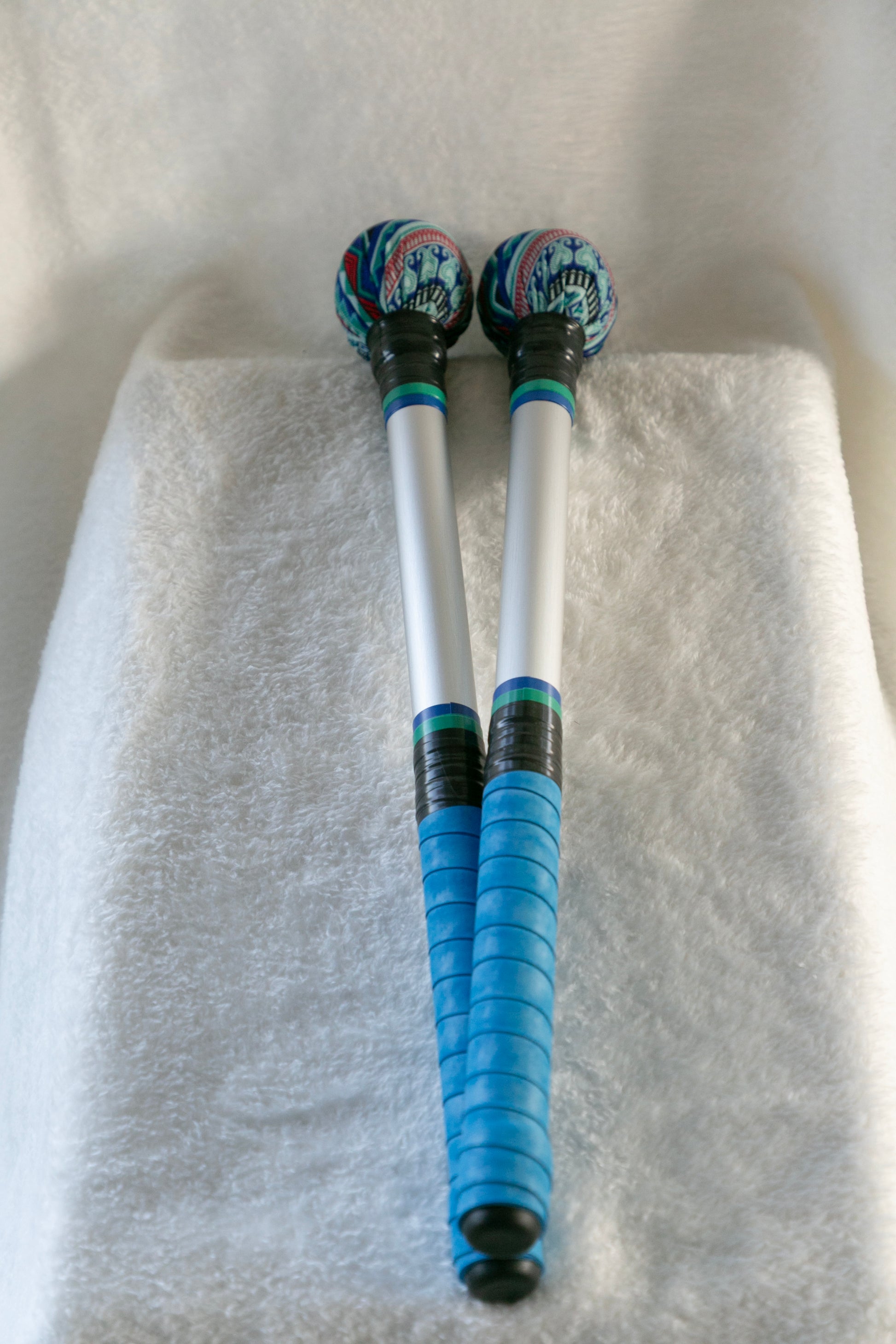 Mazas de aluminio anodizado en plata. Tela de poliester estampada muy resistente y grip para un excelente agarre.
